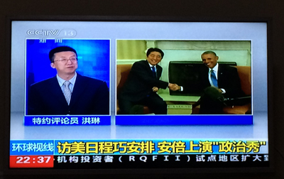 中国国営テレビは、安倍がオバマとにこやかに握手してる