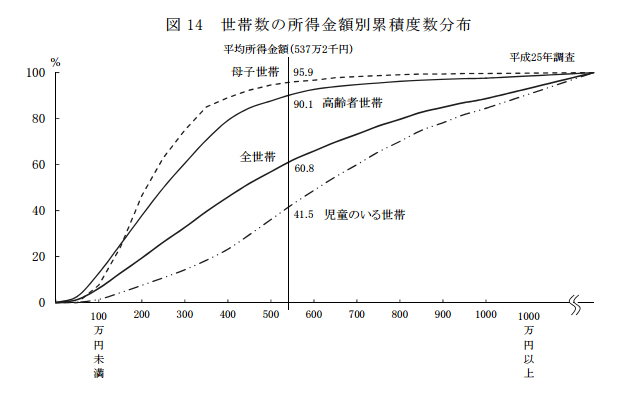 もっとも目立つのが、母子世帯です。96%の母子世帯が、日本の平均所得以下で