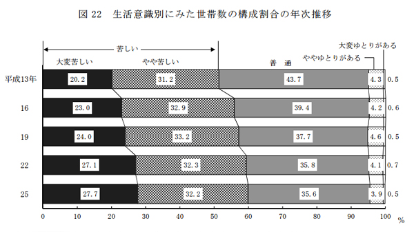 が増加していることがわかります。苦しいと感じる世帯が増えている分、減ったのは、