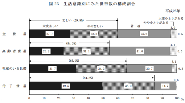 一目瞭然。母子世帯、子供のいる世帯、高齢者世帯が、「大変苦しい」「苦しい」