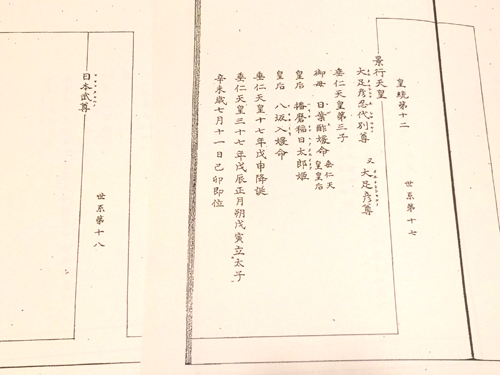 写真右の欄が、皇統第十二、世系第十七 景行天皇。