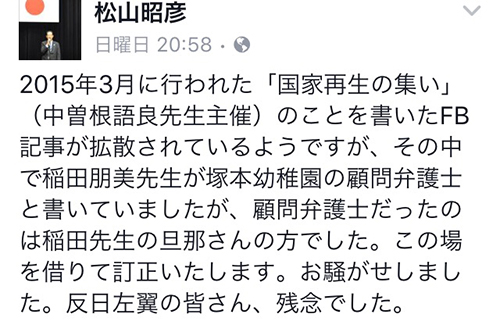 稲田氏は否定し、この投稿をした保守の会会長・松山氏から