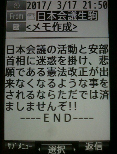 3月17日、日本会議の奈良生駒支部の人間から、籠池理事長宛て