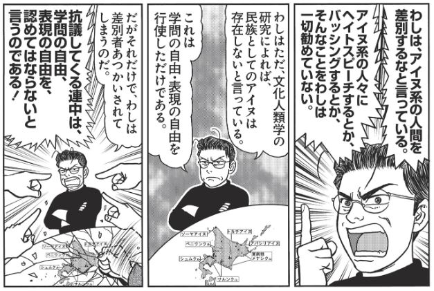 今週のSPA!の小林よしのり氏のマンガより。結局、小林氏の主張は「差別する自由を奪うな」というこの一点に尽きるのですよね。これがヘイトスピーチを生み、社会を劣化させてきました。それにしても私はいまこんな髪型じゃないんで、一度埼玉県の職場にデッサン帳持ってきてくれませんかね? pic.twitter.com/QKRprWWXfC