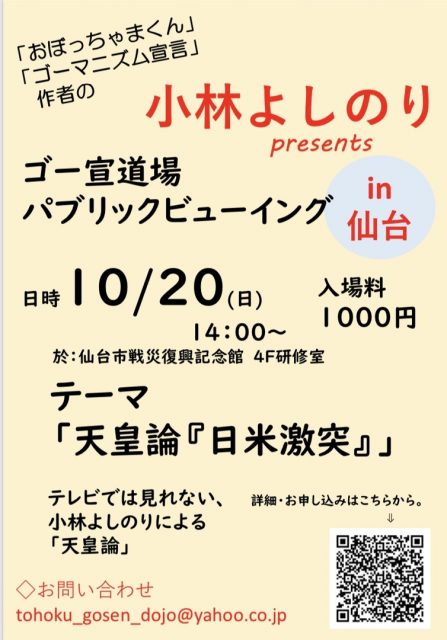 10/20(日)『ゴー宣道場 東北パブリックビューイング』もまだ申し込み可能です!!