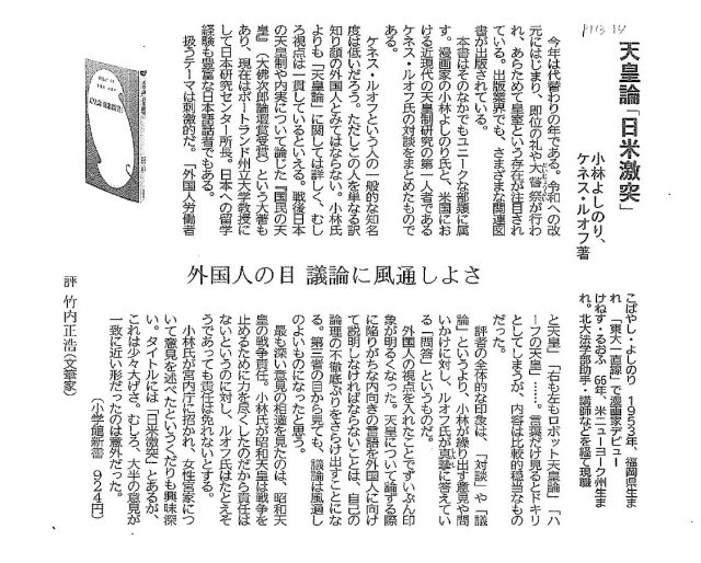 評者がどこを読んで「小林氏はルオフ氏よりも『天皇論』について詳しくなく、視点は一貫していない」と感じたのかは定かではありませんが、本全体に関しては好意的な書評です。