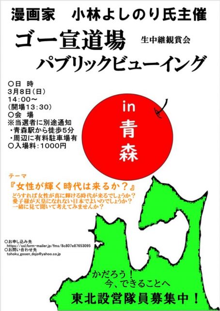 ですので、東北ゴー宣道場設営隊は、青森で、パブリックビューイングを開催することにしました!