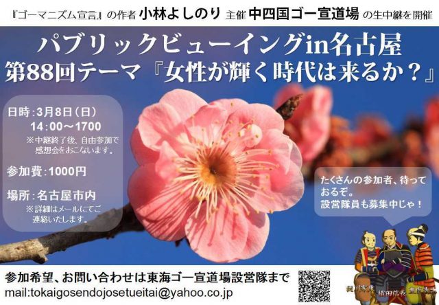 3月のゴー宣道場は、岡山で初開催の中四国ゴー宣道場。テーマは、「女性が輝く時代は来るか?」。