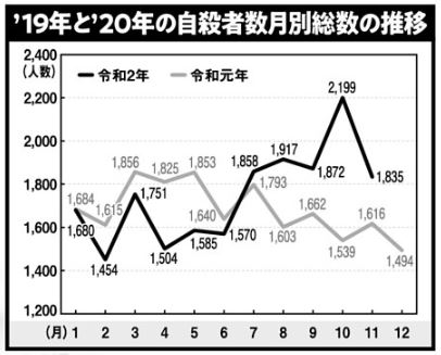 「19年と20年の自殺者数月別総数の推移」のグラフで、「コロナ自粛禍」が何をもたらしたか明瞭に分かります。