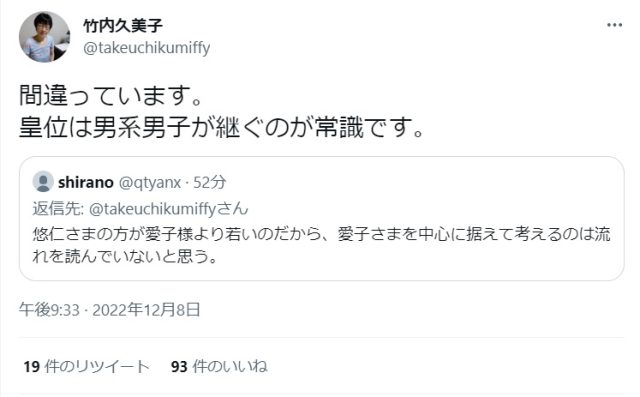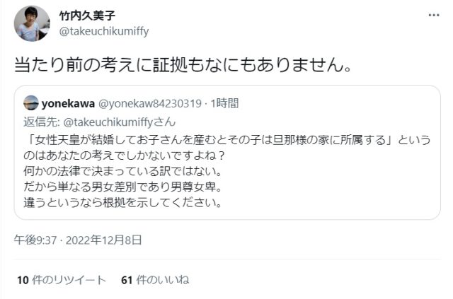 昨日、レイプ肯定・竹内久美子の男系カルト主張を批判している人がいました。