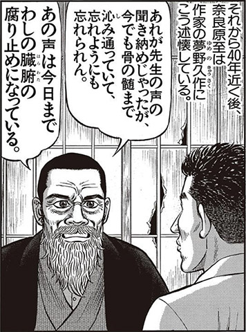 投獄されていた奈良原至ら少年志士を救うため、責任を一人で被った武部小四郎が、斬首のため連行される途中に、絶大な気合を込めて少年たちに放った咆哮を思い出しながらの述懐です。