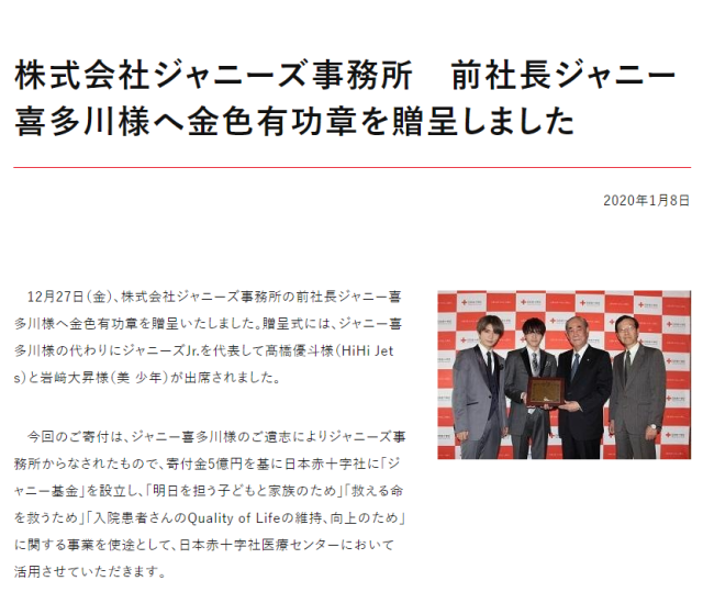 日本赤十字社はジャニー喜多川に「金色有功章」を贈呈、寄付金を基に「ジャニー基金」が設立され、「明日を担う子どもと家族のため」「救える命を救うため」「入院患者さんのQuality of Lifeの維持、向上のため」に関する事業につかわれているそうです。