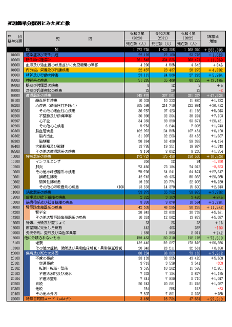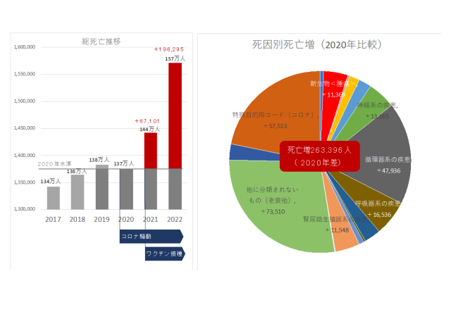 死因は毎年9月頃前年分が発表されており、コロナありワクチンなしの2020年と比較した2年間の増加分26万人の内訳は