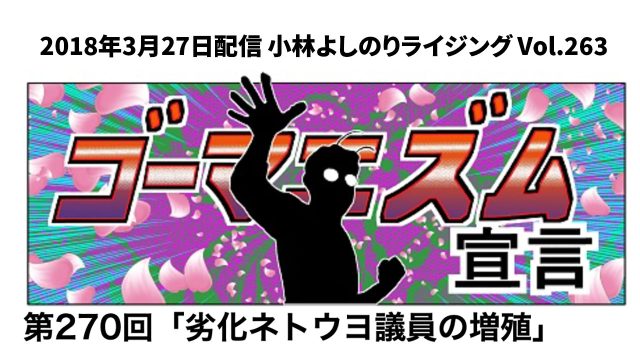 先の記事で挙げた池田佳隆・衆議院議員について、過去にゴー宣関連での言及がないか調べてみたところ、2018年3月27日配信の小林よしのりライジングVol.263に登場していました。