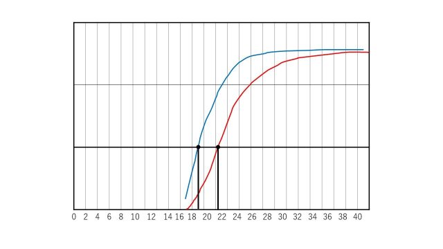 何か青と赤の曲線があって、どうやら太い横線と交わるときのX軸の数値を読み取っているのだな。