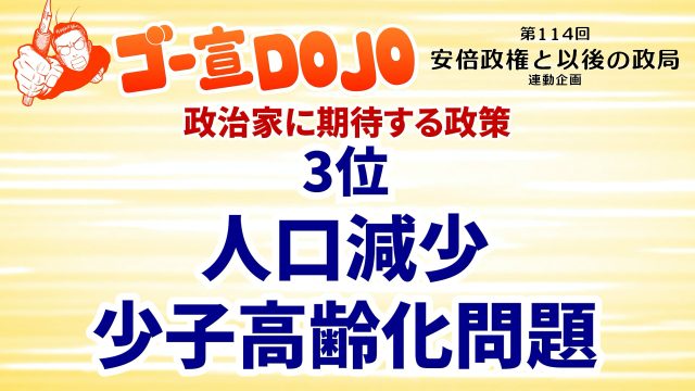 戦後日本の発展が人口増に支えられたものとすると、現在の社会停滞において、タマゴとニワトリ的に大きく関わってくるのがこの問題。はたして「政治によって好転」させる事ができるのか?という根本も含め、あらゆる社会的テーマに例外なく関わってくる要素です。