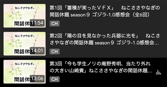 現在、ニコニコ動画のゴー宣ネット道場チャンネルで「ねこささやなぎの閑話休題 ゴジラ-1.0感想会」シリーズ(全6回)を3回目まで配信していますが、