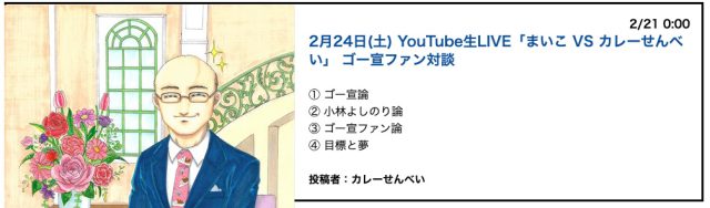 なんと、行けそうになったまさにその日時に「世界のゴー宣ファンサイト」カレーせんべいさんの配信予告が!それも、よしりん先生作品の感想や、ゴー宣創作隊で大活躍中のまいこさんがゲスト!