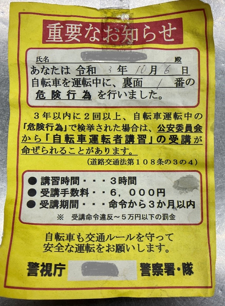 自分の目の前で自転車走行していた人が警察に捕まったのです。
