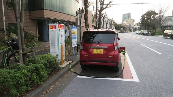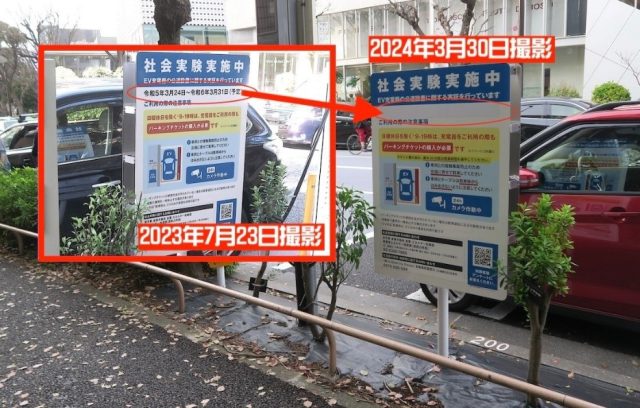 代官山の都道317号(旧山手通り)にある「EV給電施設」が昨日3/31で社会実験が終わって撤去のはずが予定期限を消してまだ置いてある。