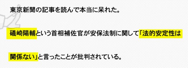 この時は、安保法制に関して「法的安定性は関係ない」というトンデモ発言をしていたようで、