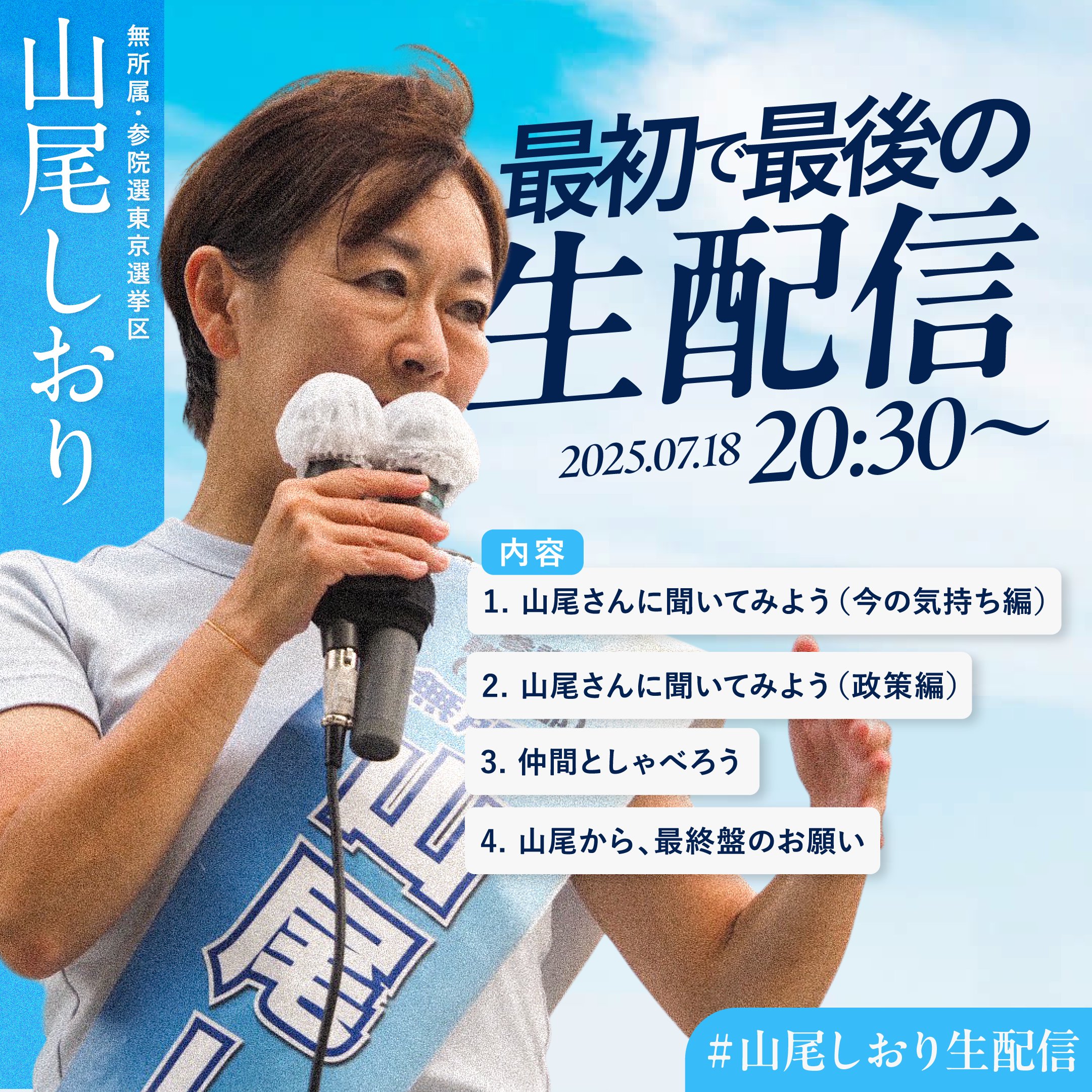 このあと20:30から、山尾しおりさん選挙戦中最初で最後の生放送!!
