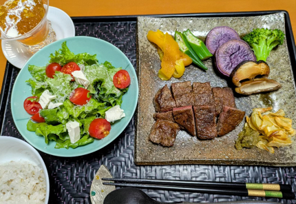 (肉には塩使わず胡椒のみ、柚子胡椒とニンニクスライスをソースに)
