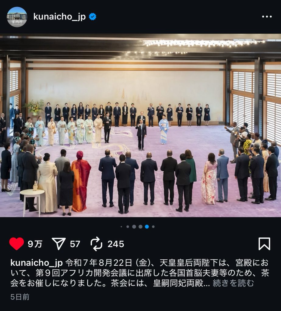 8/22に、第9回アフリカ開発会議に出席した27カ国の各国首脳夫妻等を招いて宮中で行われたお茶会。
