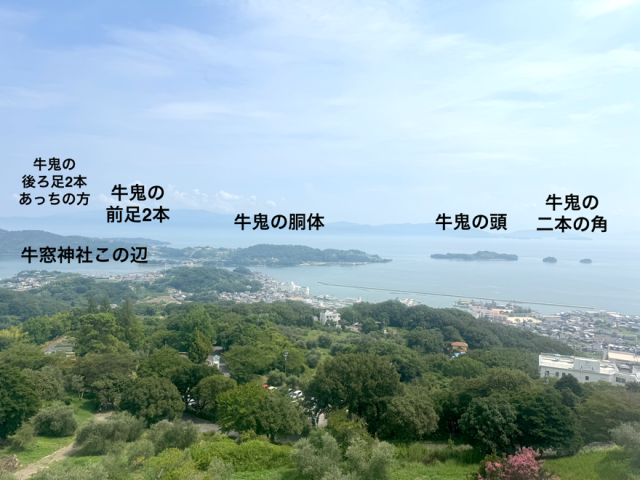 牛窓オリーブ園から眺めるとバラバラになった五つの島が見えます。