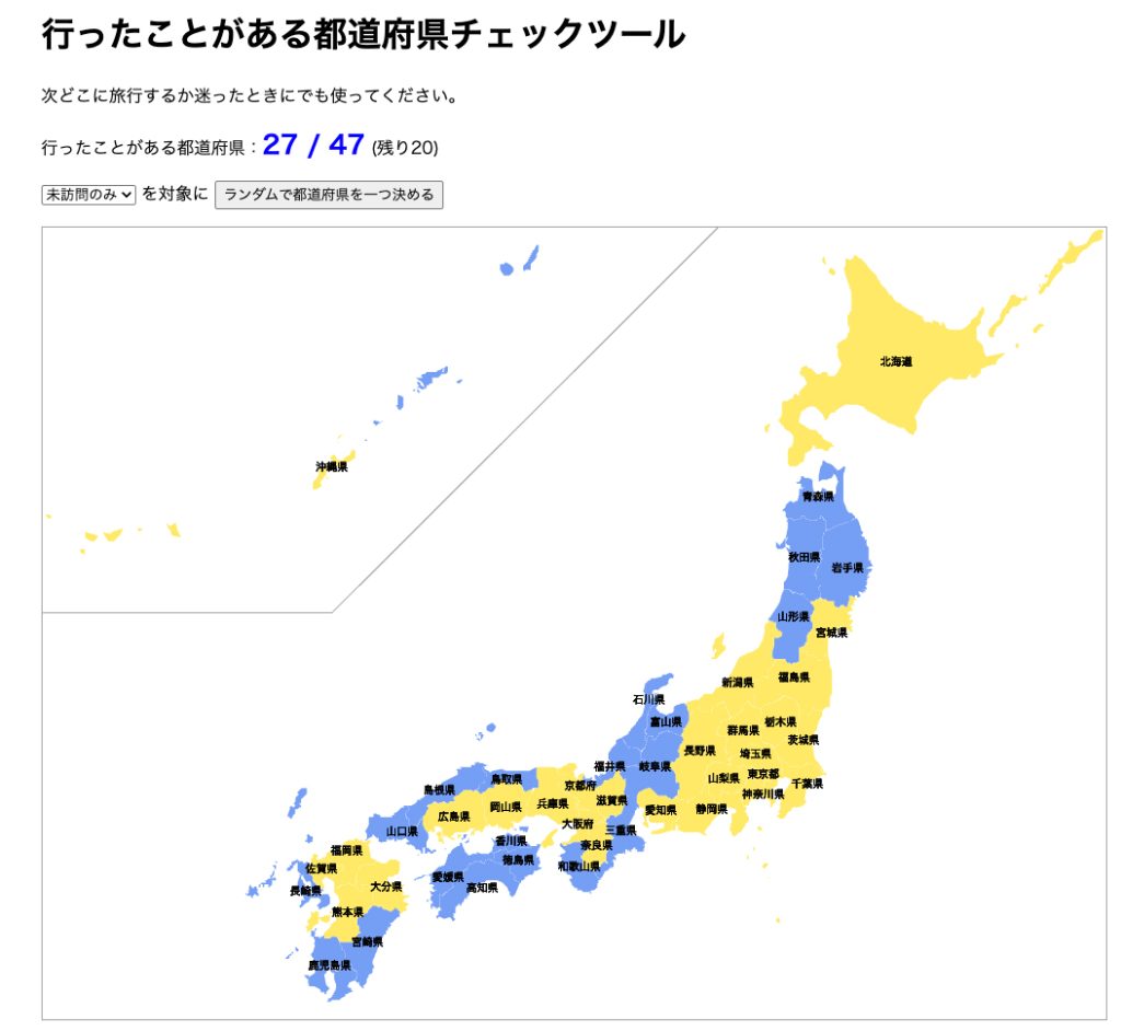 「行ったことがある都道府県チェックツール」というwebサイトでカウントしてみると、(単なる通過を除いて、何時間かでも滞在したという程度の条件でも)、まだ未踏の県が20もある!