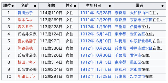 興味をもって、きょう現在の日本の長寿ランクを調べてみると
