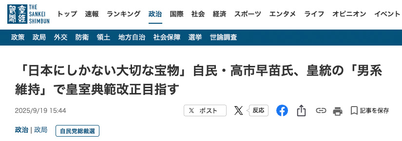今日の総裁選出馬会見でも、お決まり通りの男系固執発言を繰り返しています。