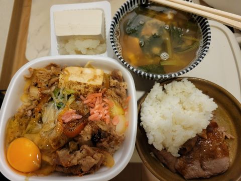 すき焼き丼(特盛り・卵つき)、豆腐(木綿)、大根おろし(自家製)、味噌汁(もやし・わかめ・豆腐)、牛肉とご飯(子供の食べ残し)