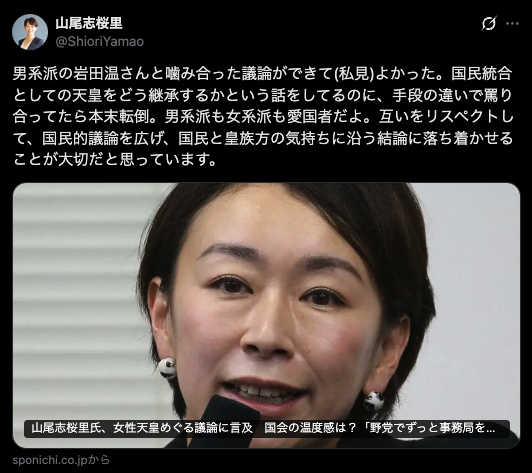 繰り返しますが、皇統問題に関する議論は「どっちも有りな手段の議論」ではありません(そんな事、山尾さんがわかっていないはずは無いですよね)。そして、番組といった公開議論の場において、訴えっかけるべき相手は「共演者」ではなく観客(=国民)です。