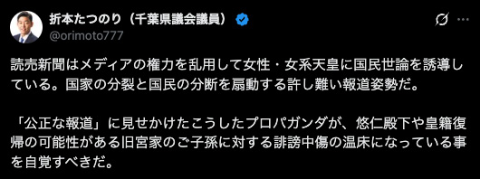 ここで折本議員が批判すべきは、メディアではなく、性別を問わない皇位継承を支持する多くの国民という事になります。ぜひ「男の血こそが尊い!」という価値観を、街頭演説などで連呼される事を期待します。