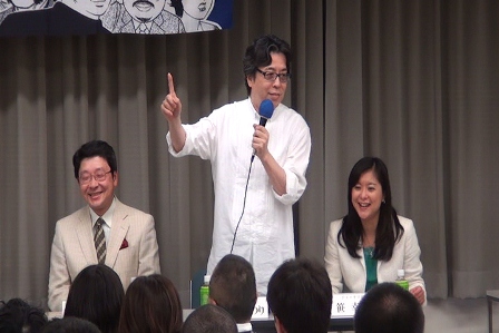まず、よしりん師範の挨拶から 第1部が始まりました。よしりん師範は、 専門家を呼ばずに 原発問題をやると言った 「ゴー宣道場」に、これほど 応募者が殺到したことから、 今のメディアや それを受け取る側の国民が どのような状況に陥って いるのかを分析しました。そして、この問題は 「受け手」の側だ と言います